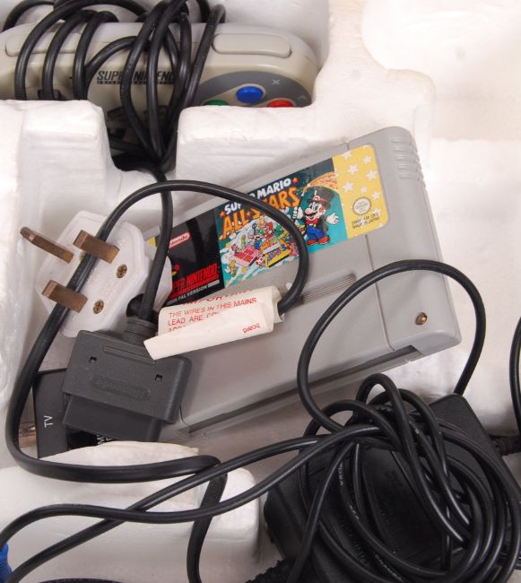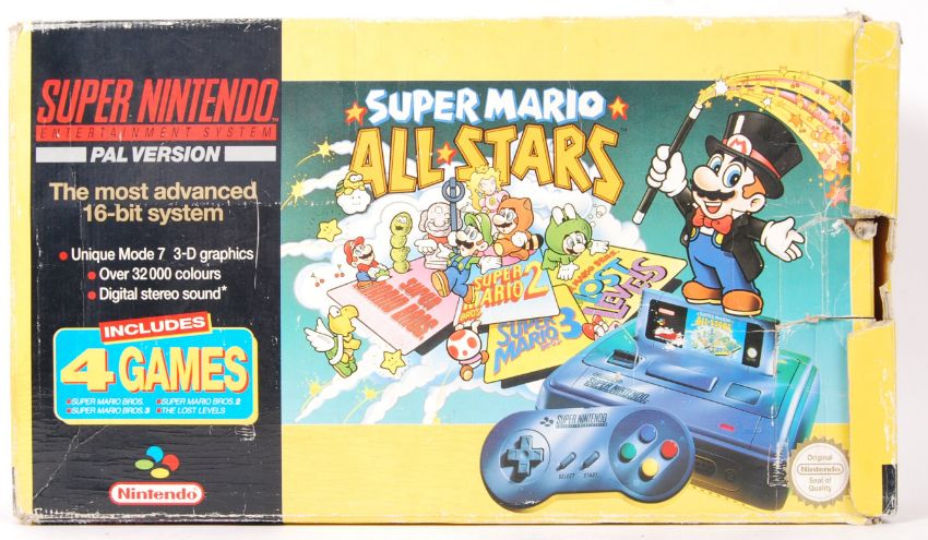 An original SNES Super Nintendo Entertainment System games console with ' Super Mario All Stars ' cartridge. Within the original box. Appears complete with controller, adaptor and television lead.