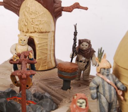 An original vintage Palitoy / Kenner made Star Wars action figure playset ' Ewok Village .' Unboxed. Comes with an assortment of vintage Ewok action figures (some with accessories) and a Han Solo action figure.