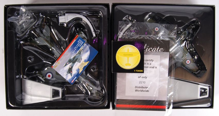 Four 1/72 scale Corgi Aviation Archive diecast model fighter planes comprising of; AA39202 Spitfire MkI, AA38703 Spitfire MkXIV, AA37302 DH Vampire & AA32713 Hawker Hunter F.6. Mint, within the original boxes.