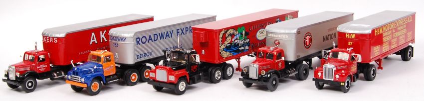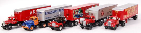 A collection of 5x American made First Gear 1:34 scale precision diecast model lorries / Mack trucks. All haulage related. To include; Akers, Roadway Express, 250th Anniversary of Reading PA and H&W Motor Express Co. All appear mint and complete. Unboxed. Only ever displayed.