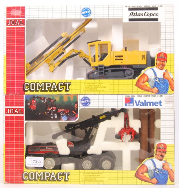 Two Joal Compact diecast 1:35 scale construction related models, comprising of; No. 262 Atlas Copco Surface Crawler and No. 154 Valmet Forest Harvester. Both appear mint and unused, within the original boxes. Note: from an extensive private collection of Joal and other construction related diecast models. All boxed models are generally mint to mint+ (unless specified). Most are unremoved from their original boxes. Buyers are reminded to satisfy themeselves as to condition of individual lots, as some, will vary.