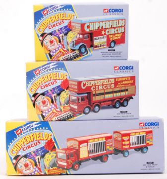 A collection of 3x Corgi Chipperfields Circus diecast model sets. Comprising of; 97092 Bedford Pantechnicon Billy Smee Wardrobe, 97896 AEC Pole Truck and 97889 AEC Cage Truck & Trailer. All mint, and unused. Boxed.