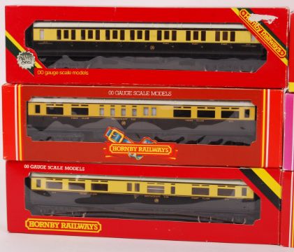 A collection of 6x Hornby 00 gauge railway trainset rolling stock GWR carriages. All appear boxed and mint. Comprising of: R4025A (Top Link), R4027 (Top Link), R4026 (Top Link), R454 Restaurant Car, R458 Restaurant Car, and R429. Boxed.