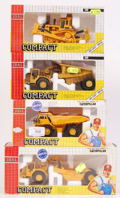 A collection of 4x Joal Compact diecast 1:70 scale construction related models, comprising of; No. 222 CAT631 Tractor, 220 Chain Tractor D10, 219 Caterpillar 631D and 223 Caterpillar Dumper Truck 773-B . All appear mint and unused, within the original boxes. Note: from an extensive private collection of Joal and other construction related diecast models. All boxed models are generally mint to mint+ (unless specified). Most are unremoved from their original boxes. Buyers are reminded to satisfy themeselves as to condition of individual lots, as some, will vary.