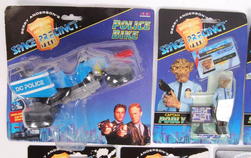 A collection of 6x Vivid Imaginations made ' Space Precinct 2040 ' carded action figures and vehicles. All sealed, unused and carded. To include; Snake, Brogan, Haldane, Police Bike and others.