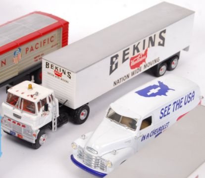 A collection of 10x assorted 1:50 (and other) scale diecast model haulers / American trucks. Mostly Corgi, but also ERTL, First Gear and others present. All unboxed. Largely appear very good to mint condition.
