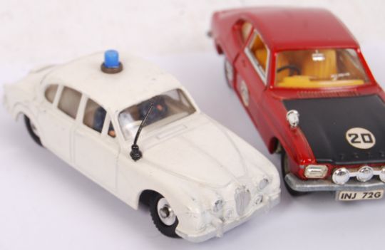 A collection of 5x loose very near mint to mint vintage Dinky diecast models. All unboxed. Comprising of; Ford Capri (very near mint, red body with black bonnet and '20' decals to sides), Jaguar 3.4 Litre Police Car (good to very good), 145 Singer Vogue (very near mint), 139 Ford Cortina (mint), and Vauxhall Victor Ambulance (very near mint). Good collection.