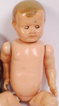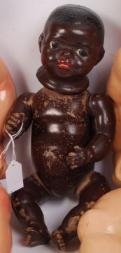 Three antique dolls; to include a 1930's composition black doll, and 2x 1950's composition larger dolls, one with noise mechanism to rear (not working). No markers marks. Tallest being; 61cm.