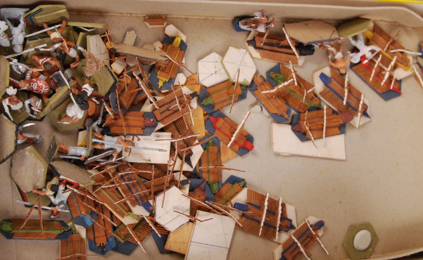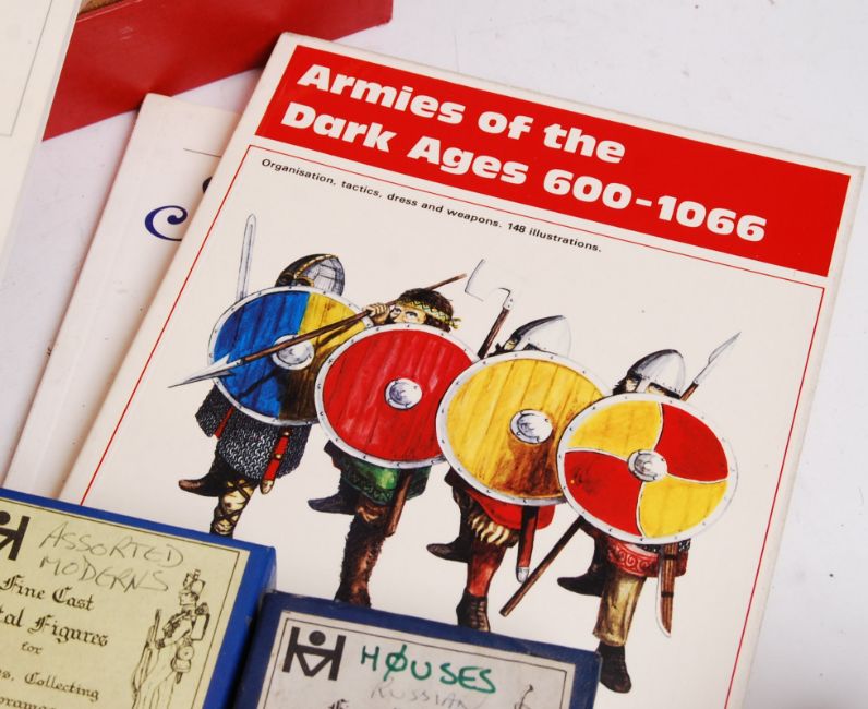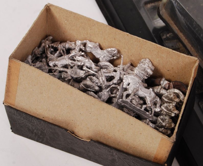 A large collection of assorted 25mm white metal hollowcast / diecast war gaming / model soldier making related items. To include a large quantity of unpainted white metal figures (likely Hinchcliffe or Minifigs), cavalry, infantry etc, a quantity of painted / part painted figures. Various accessories of differing scales also present. Along with a set of Richard Nelson ' War Games Research Groups ' books / guides. Many hundreds of figures present.