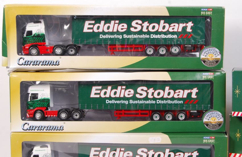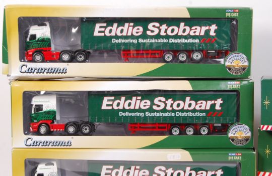 A large collection of Eddie Stobart related diecast models. To include 5x Corgi model sets; 58112, 59502, 59601, 59516 and 29103. All appear within the original boxes. Along with 4x Cararama 1:50 scale diecast Eddie Stobart lorries, all boxed. x9 items in total.