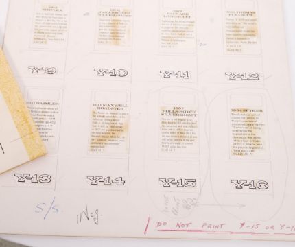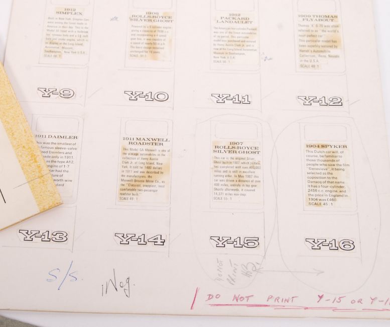 A collection of assorted original 1960's Matchbox Lesney Models Of Yesteryear diecast model box artwork. Various panels and panes of artwork and related box text. To include a small original watercolour / mixed media painting (likely for an end flap) of model Y-5 1907 Peugeot, various information panels for end flaps of various models, box layout for Y-8 1914 Stutz and various other related pieces of paper / printers boards etc. Rare.
