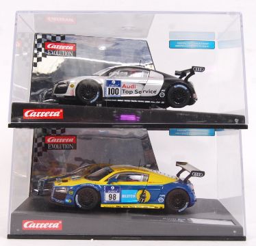 Two 1/32 scale Carrera Evolution plastic racing slot cars to include; 27321 Audi R8 LMS & 27322 Audi R8 LMS Team Phoenix. Both within their original plastic cases, as new.