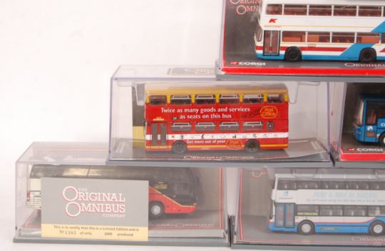 A collection of 10x assorted Corgi Original Omnibus Company 1:76 scale diecast model buses. Each limited edition, within the original display boxes. To include; 45108, 42807, 43614, 44205, OM45110, 42701 and others.