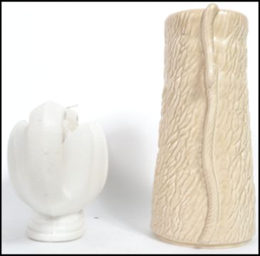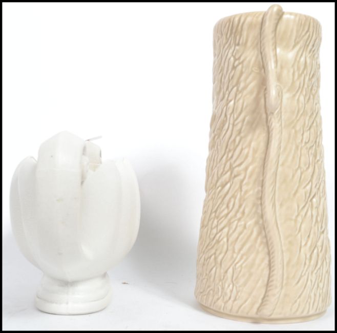 A SylvaC textured ceramic vase having impressed marks to base 3371 along with a Wade basalt twin handled planter with marks to base. Highest measures 27 cm and widest measures 33 cm.