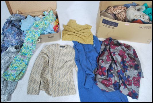 A collection of vintage and retro 20th century ladies clothes to include printed dresses, blouses, skirts etc. Contained within a retro suitcase.