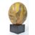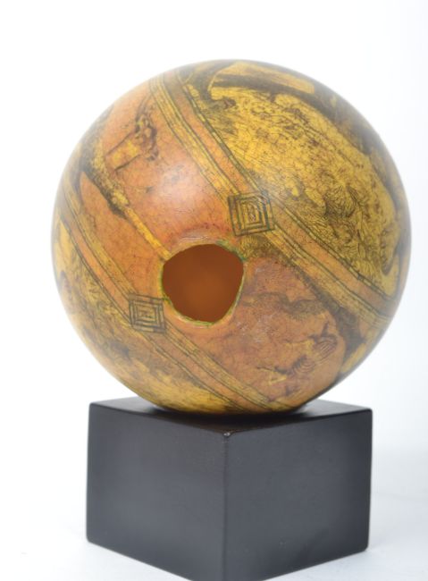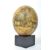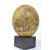 A Victorian style painted ostrich egg having a yellow ground depicting scenes of lions, ostrich, giraffes, zebra, antelope raised on a ebonised square plinth base.