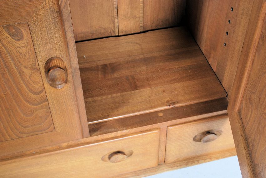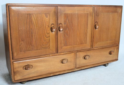 A retro Ercol 20th century windsor pattern golden dawn elm sideboard having a series of drawers over cupboards beneath, moving on castors.