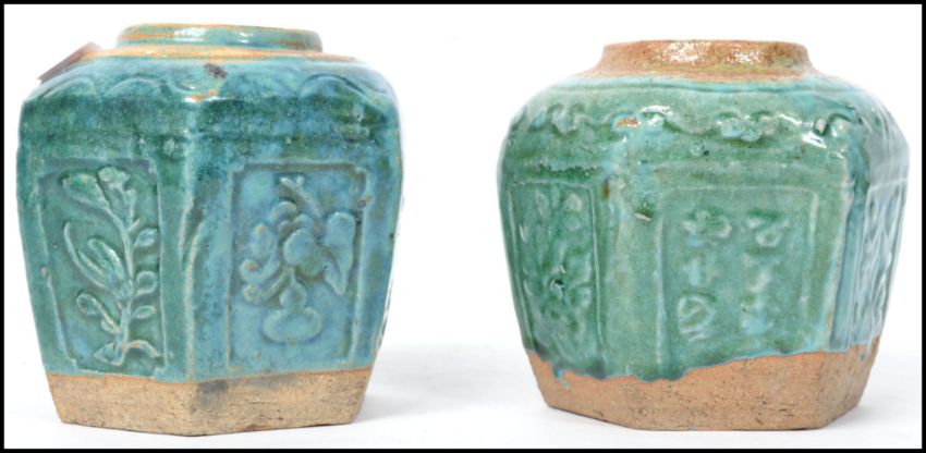 A pair of Oriental Chinese ceramic stoneware ginger gars of hexagonal form having a green glaze finish. Measures: 11cm high x 12cm deep x 14cm wide.