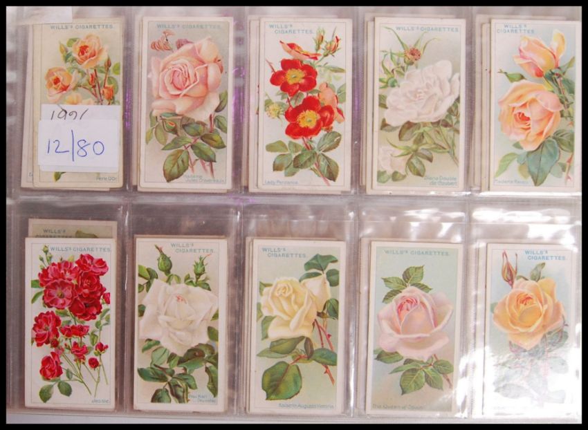 Cigarette Cards: An album of assorted vintage cigarette cards, all complete sets. From a large private collection, including cigarette, cigar and tea cards. This album featuring all Wills cards. Including; Radio Celebrities, Railway Engines, Railway Equipment, Railway Locomotives, The Series of 50 Roses, Roses, Rugby Internationals, Safety First, Ship's Badges, Signalling Series, Speed, and Strange Craft