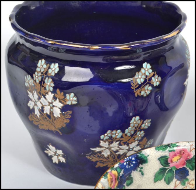 A collection of 19th century and other ceramics to include a blue ground planter with painted flowers, a Crown Ducal floral bowl, a Cleopatra classical tazza, two Imari style meat serving trays along with a cranberry glass bowl and a large cut glass bowl. Highest measures 17 cm and Diameter measures 23 cm.