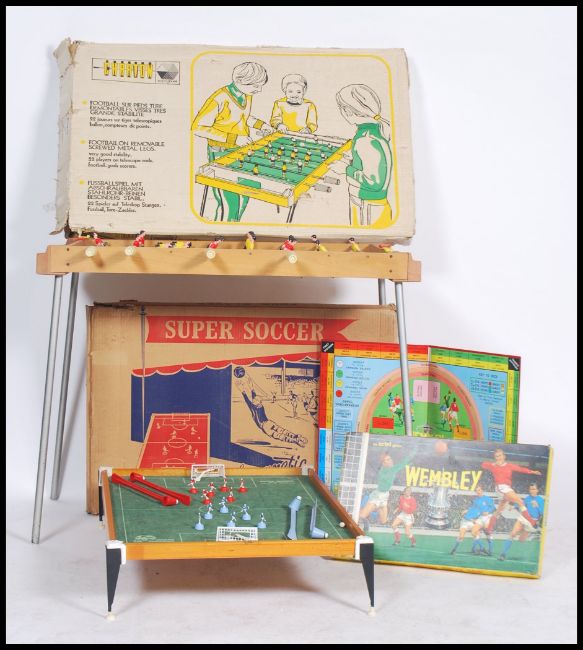 A vintage 20th century retro 1970s French made Fussball / Fuzball / Foosball table football game raised on four legs complete in original box along with a 20th century Super Football four player magnetic table football game and a Boxed Wembley football game by Ariel.