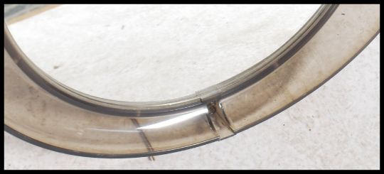 A vintage 20th century retro wall mirror of circular form being held in an oval smokey acrylic frame. Measures: 93cm high x 62cm wide x 59cm deep.