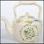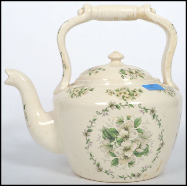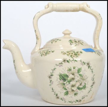 A large 20th century ceramic cream glaze cauldron kettle of Staffordshire origin with lid and a decorative green foliate spray decoration. Measurements: 26 cm high, 24 cm wide and 33 cm deep.