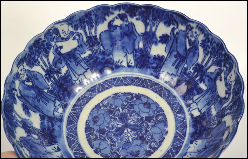 A late 19th / early 20th century Oriental blue and white ceramic bowl of scalloped form having a central floral medallion and depicting scenes of elders. Measures 11 cm high and 25 cm diameter.