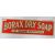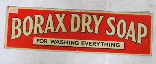 A vintage 20th century advertising point of sale shop display sign for Borax Dry Soap for washing everything having a red ground with yellow lettering.