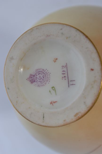 A Royal Worcester ivory blush ceramic vase of globular form having painted floral spays with waisted neck and flared rim. Puce factory marks to base.