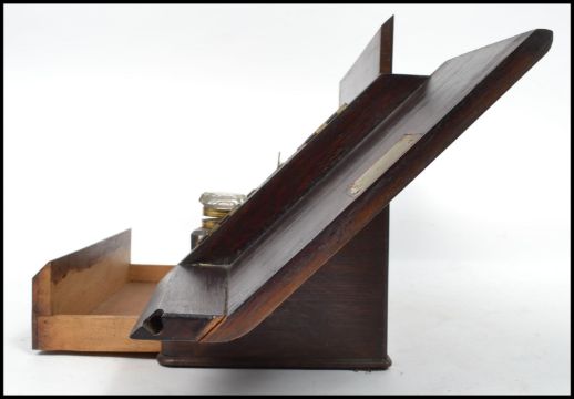 A vintage 1920s oak metamorphic oak desk top stationary chest opening to reveal a fully appointed interior. Measures 26 cm high, 30 cm wide and 17 cm deep.
