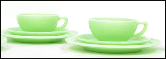 An early 20th century Art Deco vaseline glass coffee set having dog pictorials to each piece to include cups saucers, sugar bowl, creamer jug etc. Measures 6 cm high and 15 cm diameter.