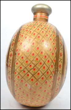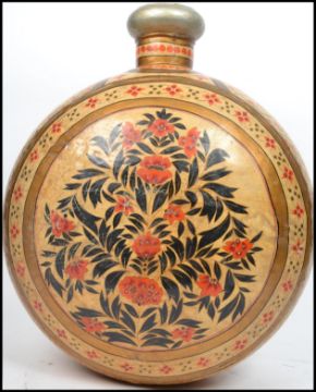 A vintage 20th century large metal moon flask vase the globular body decorated with floral spays and geometric patterns on an ivory blush ground.  Measures 58 cm high, 54 cm wide and 30 cm deep.
