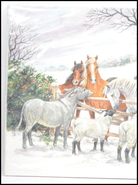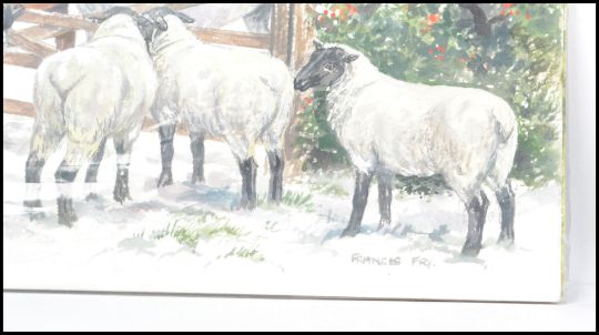 FRANCES FRY (20th Century British) - watercolour paintings / studies grazing donkeys eating hay in a winter field setting together with horses, sheep and donkey meeting at the gates of a winter field both being signed to the corner. Largest measures 55cms x 38cms
