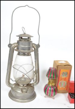 A collection of curios to include boxed dominoes, cribbage boards, a box wood chess set, oil lamp etc please see images. Highest measures 44 cm.