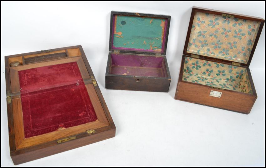 A group of three 19th century Victorian boxes, one being a walnut writing slope with fitted interior and the others being mahogany work boxes with mother of pearl inlaid cartouche panels.