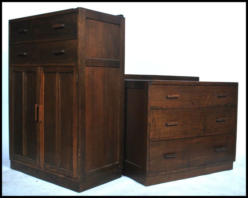 A 1930's utility oak tallboy linen chest cupboard together with a matching chest of drawers being raised on plinth base. Both with pull handles. Measures: 124cm high x 84cm wide(largest)