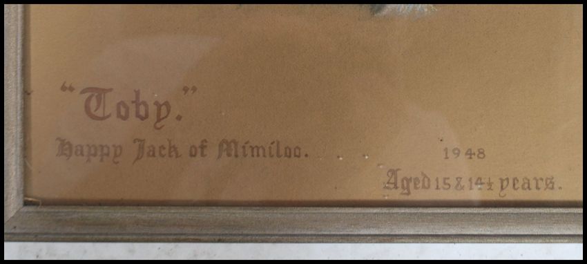 A framed and glazed mid 20th century pastel portrait painting picture of a pair of Cavalier King Charles Spaniels with notation reading ' Toby ' Happy Jack of Mimiloo and Wendy ' Little minx of Mimiloo 1948 aged 15 & 14.5 years signed Beatrice M White 1948 ( American 1908 - 1995 )