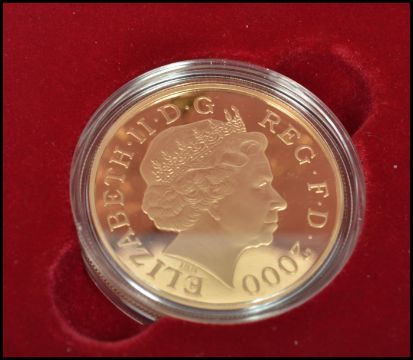 A Royal Mint Queen Elizabeth The Queen Mother Centenary Year 22ct Gold Centenary Crown Five Pound Coin 1999-2000 no 2588/3000. Weighs 39.94gms and measures 38.61mm. Complete in original velvet box with certificate, protector and booklet with outer sleeve.
