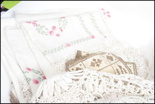 A large quantity of 19th century linens and lace to include large bedspread, embroidered table cloth, pillow cases etc.