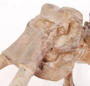 A plaster and resin scientific Osteology scaled down study of an adult  Woolly Mammoth displaying the skeleton with upturned tusks. measures 42cms high x 77cms long