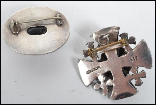 Two vintage silver white metal brooches. One in the form of a Celtic cross with a mounted inset amethyst stone marked to the verso 935 Jerusalem together with another brooch please see images. Biggest measures 4 cm wide and 4 cm long.