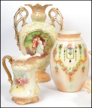 A pair of Staffordshire twin handled vases having decorative scenic panels together with a pair of  Ivory blush type baluster vases with swag decoration, Crown Devon Fieldings SF & Co jugs of varying sizes, Crown Devon type Regal Ware tazza and a Crown Devon Fieldings fruit bowl. Highest measures 33 cm.