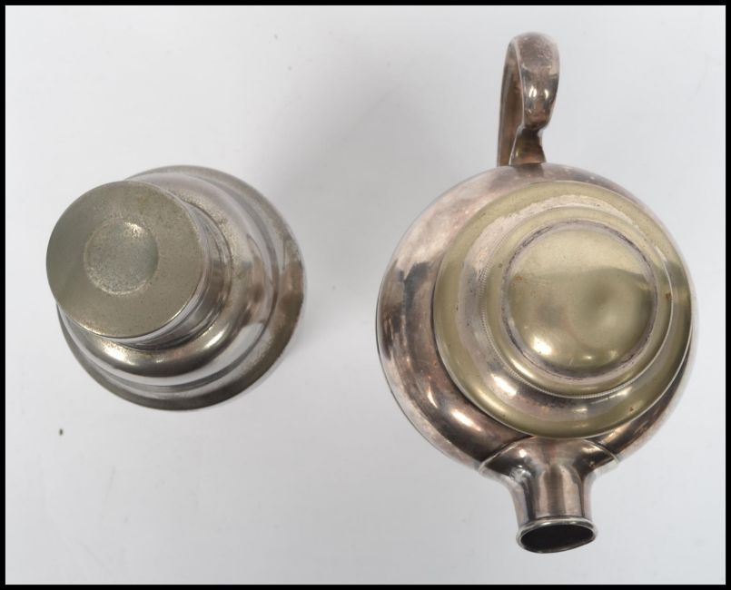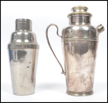 A vintage 20th century art deco Harrods of London white metal cocktail shaker along with another cocktail shaker of form.
