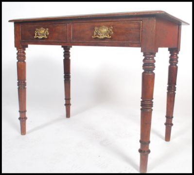 A Victorian mahogany writing table desk being raised on turned and tapering legs with twin drawers to the frieze having flared top above. Brass handles to the drawers. Measures: 75cm high x 100cm wide x 53cm deep.