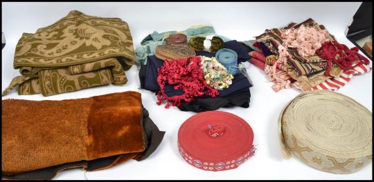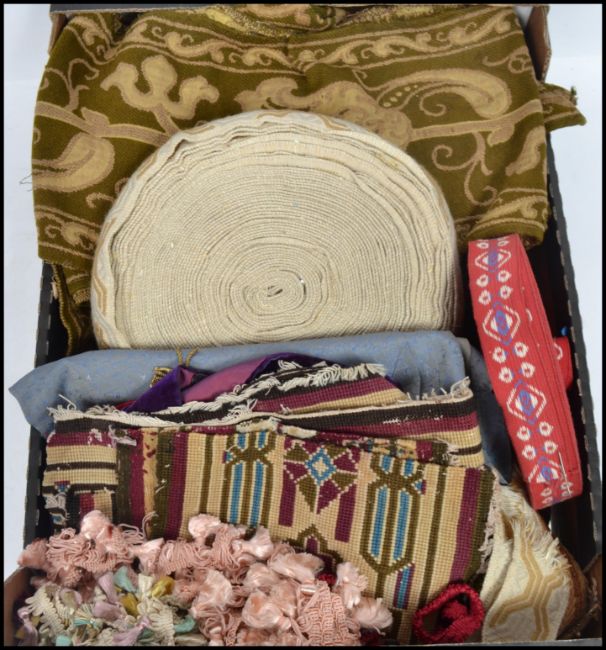 A collection of 19th century furnishing braids and fabrics including wool work and upholstery examples. Please see images.