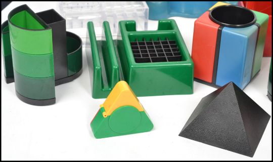 A collection of vintage 20th century retro desk top stationary items to include various stacking, metamorphic and coloured pieces. Please see images. Highest measures 15 cm.