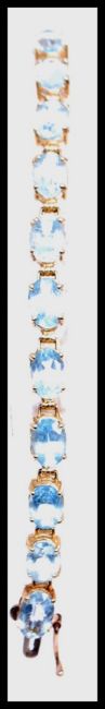 A 14ct gold and blue stone bracelet. Having 13 oval cut pale blue stones in prong set links completed with a hook clip clasp. Marked 14K tests 14ct gold. Measures 7.5 inches. Weight 9.7g.