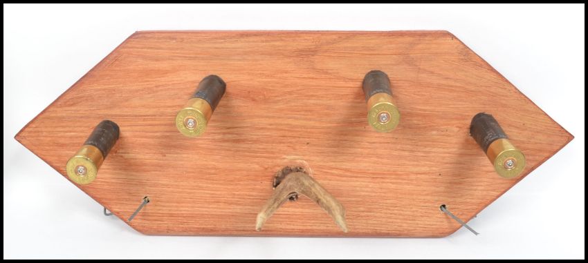 An unusual group of vintage taxidermy hunting interest antler and shot gun shell coat racks mounted on wooden backs. Highest measures 20 cm, widest measures 50.5 cm and deepest measures 15 cm.