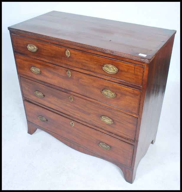 A 19th century Georgian mahogany chest of drawers being raised on bracket feet with a set of 4 graduating drawers having brass drop handles on oval back plates and finished with good brass key escutcheons. Measures: 99cm high x 102cm wide x 50cm deep.